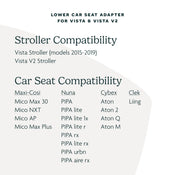 Now you can create even more configurations with your UPPABaby VISTA Stroller and turn it into a double stroller by adding a compatible car seat to the lower portion of your stroller. All our car seat adapters are FINAL SALE. We cannot guarantee compatibility.
