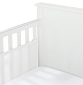 Breathable mesh crib liner designed for full-size cribs with 52" x 28" mattresses. Features long (11" x 111") and short (11" x 82") panels that install on all four sides or three sides for customizable coverage. The breathable construction promotes airflow while helping prevent limbs from getting caught between slats. Compatible with standard full-size crib frames only—not suitable for solid end styles or mini cribs. Easy installation and maintenance for safety-conscious parents.