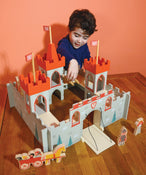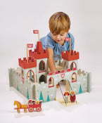 The 3 towered castle with turrets and flags is surrounded by 4 castle walls. It has a drawbridge to allow access into the interior space. An internal wall on 3 sides allows soldiers to see over. Included are 2 soldiers, a soldier on horseback, country folk in a horse and cart, and the king and queen.