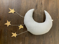 "This sweet mobile is the perfect finishing touch to any nursery! This beautiful mobile is made of pure linen and gold leather stars. This mobile measures 16" in diameter and 24" long with the cascading stars."