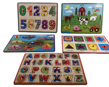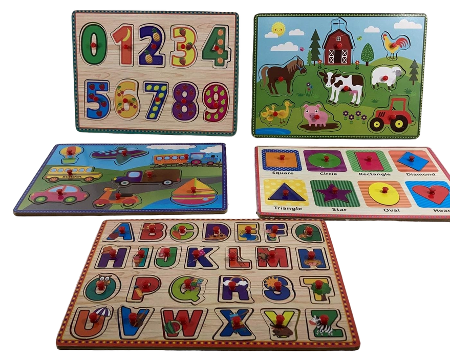 "Enjoy this young learner puzzle pack, including numbers, ABCs, farm animals, shapes, and vehicles."