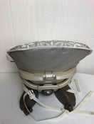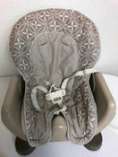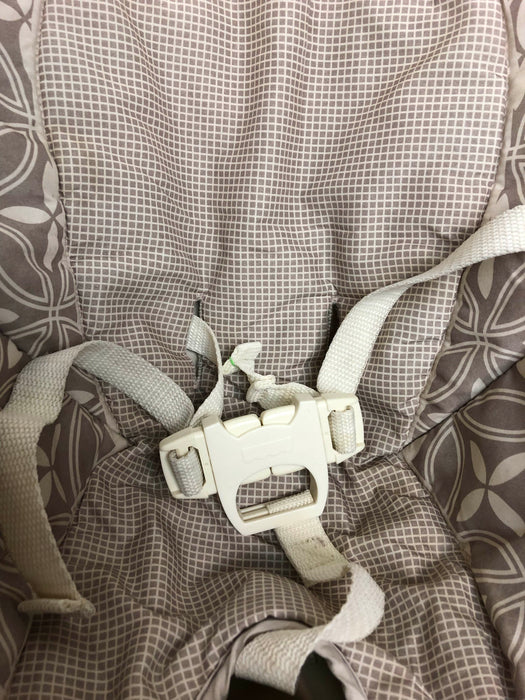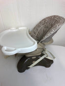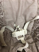"This great space-saving high chair straps securely to most standard dining chairs. Features two height adjustments and three recline positions. This one is missing the top straps so it would only work for older babies."
