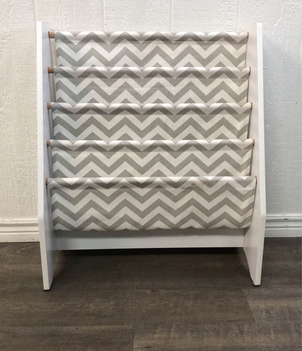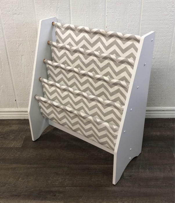 "This bookshelf displays children’s books with the covers facing out so little ones can easily select the books that interest them and put them away by themselves too! The fabric sling design keeps books protected."
