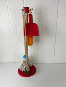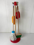 "This six-piece play set gives kids all the housekeeping tools they need to keep it clean! Sized just for kids and built to last, the broom, mop, duster, dust pan, and hand brush are comfortable to use and easy to store--just hang them from the sturdy cords onto the included stand for neat, compact storage. (The dust pan can also snap onto any of the handles.) Natural-wood handles add durability and a classic look; bright pops of color keeps lots of fun in the mix!"