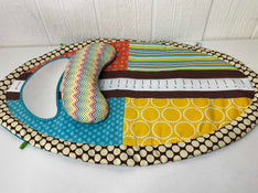 "Encourage tummy time on this colorful play mat that has loops for toys, a mirror, and a tummy time pillow for support."
