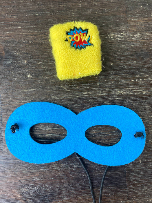 "Immediately transform into a stealth superhero with this hand made superhero cape from Goochiegoo, and coordinating mask and wrist wrap."