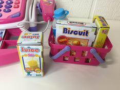 "Get ready for a rainy day shopping game with this functional cash register and checkout station. Includes some play food to ring up, money, a scanner and more."
